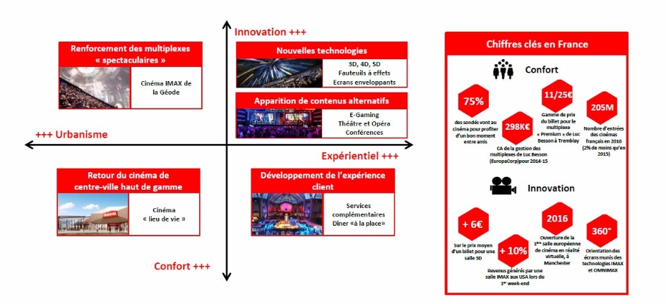Au-delà de l’expérience culturelle, les services proposés aux spectateurs ne cessent de s’enrichir : réservation en ligne, numérotation des places. Les exploitants pourraient en revanche tirer profit d’un renouvellement de l’offre de restauration : largement représentée dans les salles, elle pourrait être repensée et diversifiée pour devenir ainsi plus profitable.